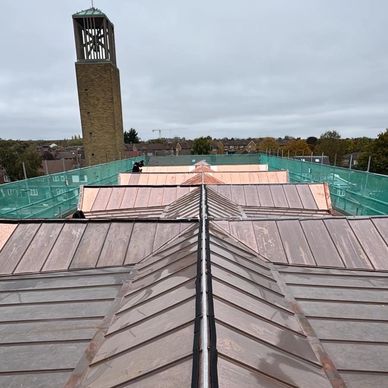 In contrast to the grey autumnal sky over Yeading, a new replacement copper roof covering shines brightly. We are nearing completion of this very prestigious project at St Raphaels Church for the Diocese of Westminster.